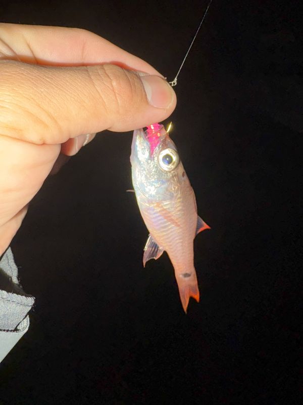 釣行開始から明るくなるまではネンブツダイが常夜灯近くに群がっていて、ルアーで目の前を泳がせたりダートアクションできびきび動かすと釣ることができていました。