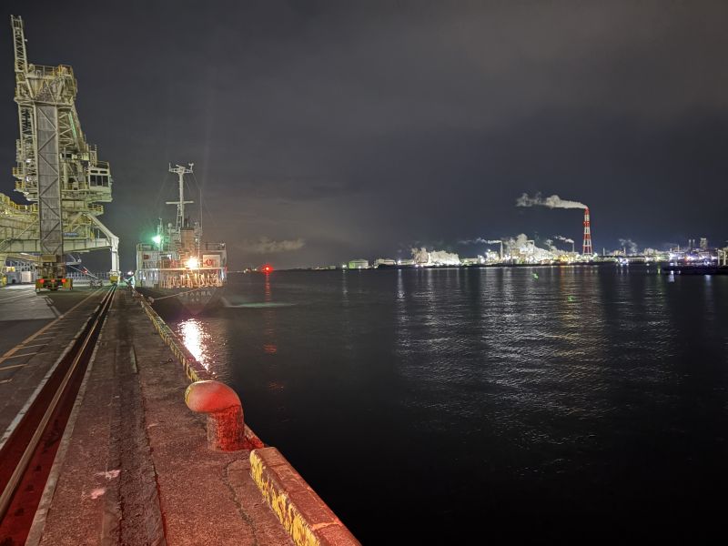 次に行った霞石炭埠頭は、船が停泊していませんでした。船が停まっていると船からの光で魚が集まってくるはずですが、今回はチャンスはなかったです。しかし常夜灯があって、足場から光が当たるところに光の明暗があります。この明暗の境に魚が待っていることが多く、今回もその位置でセイゴが釣れました。狙い通り釣れて良かったです。